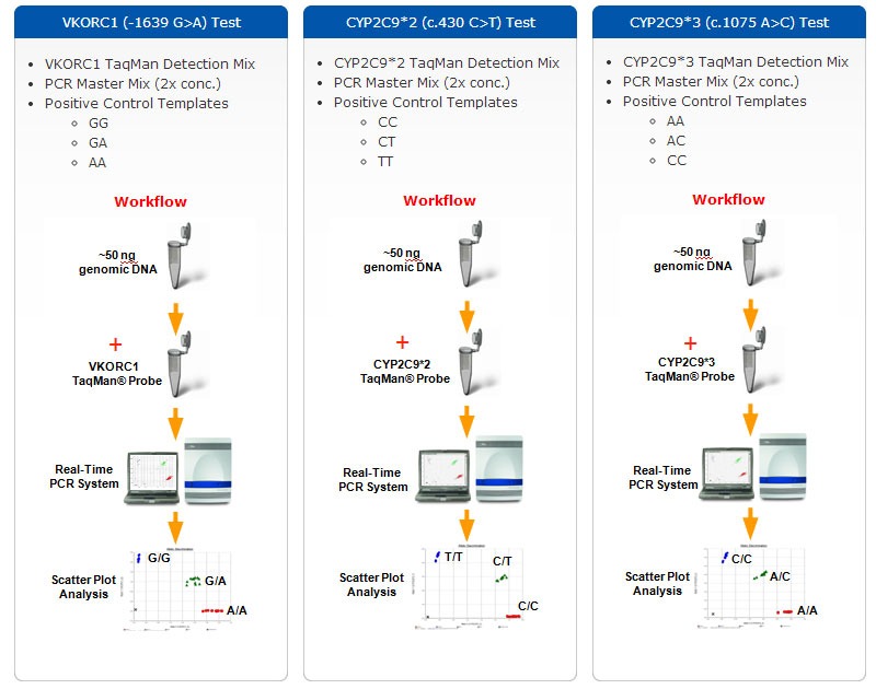 世基1639檢測套組包含:VKORC1-1639 (G>A) SNP專一偵測的引子探針混合液、三種確認結果的陽性控制組分子、聚合酶連鎖反應主要混合液與不含核酸酶的水。