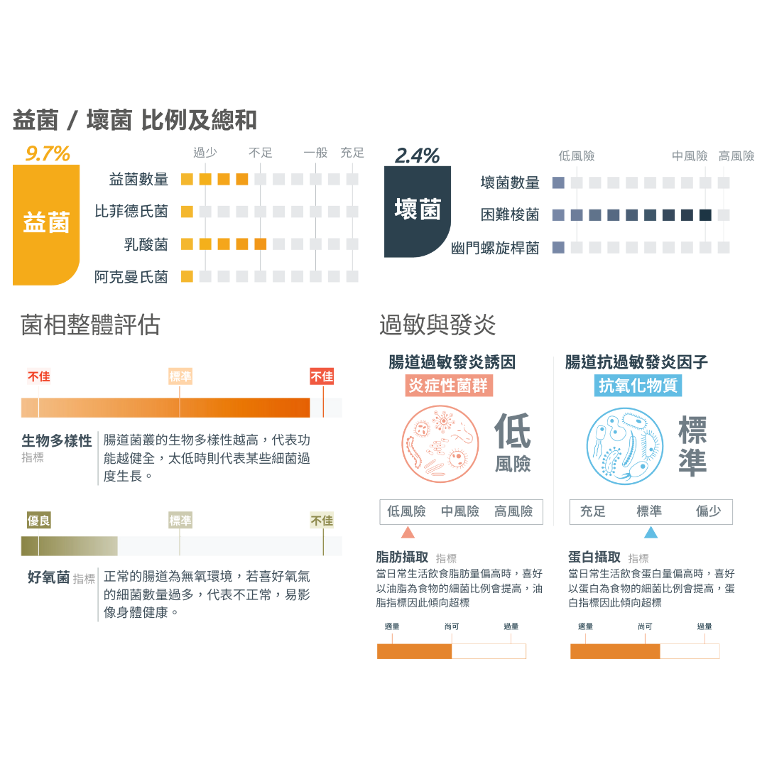根據好菌壞菌比例、便秘、腹瀉、脹氣體質、及腸胃營養吸收能力等,將您的腸道菌相分析後,對應您的主要腸道徵狀(營養失調型、腸症易感型、蠕動失常型、腸胃敏感型及體內環保型), 並給予您適當的保養方案。